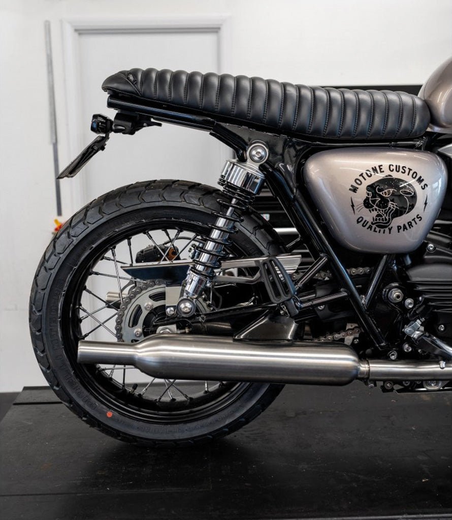 Questo portatarga corto per Triumph Bonneville è progettato per sostituire il supporto originale con una soluzione più compatta e pulita. Il sistema regolabile consente di adattare la posizione del gruppo targa e fanale in base alle preferenze estetiche e alla configurazione della moto.