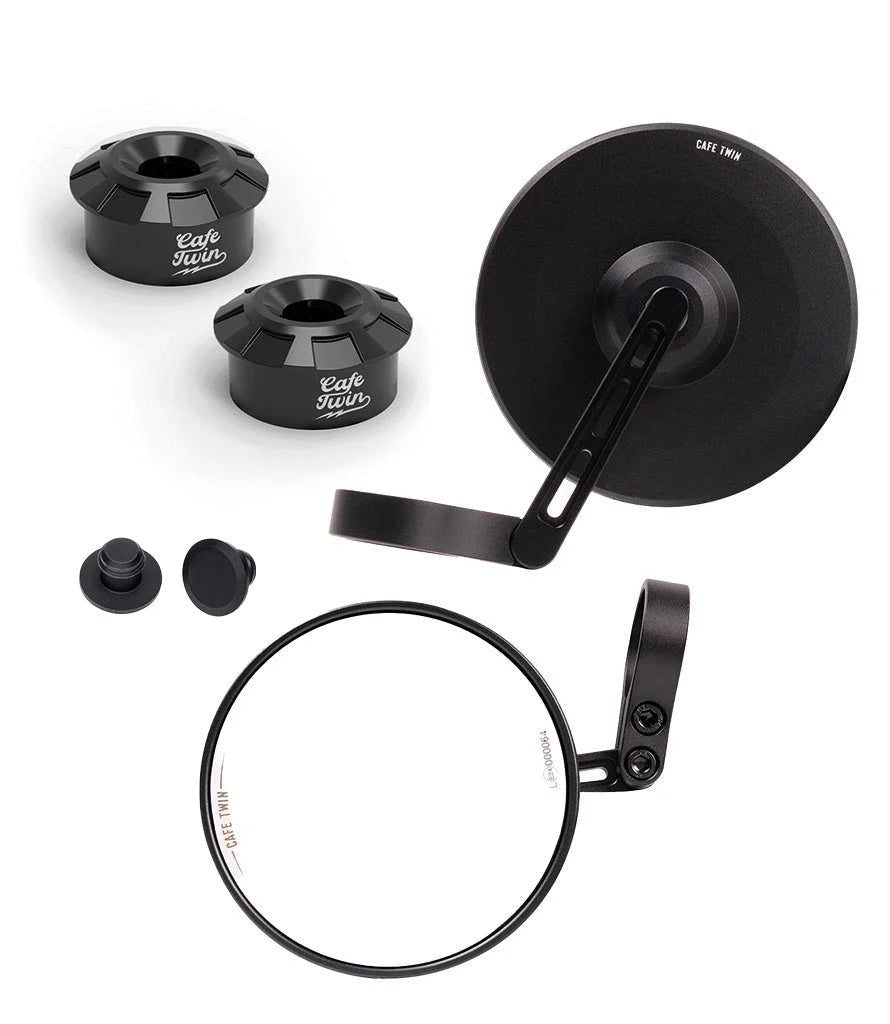 The Cafe Twin Bar End Mirror Kit is the complete solution for installing ECE approved bar end mirrors on Royal Enfield Interceptor 650 (2018–2022), enhancing aesthetics, visibility, and riding style.