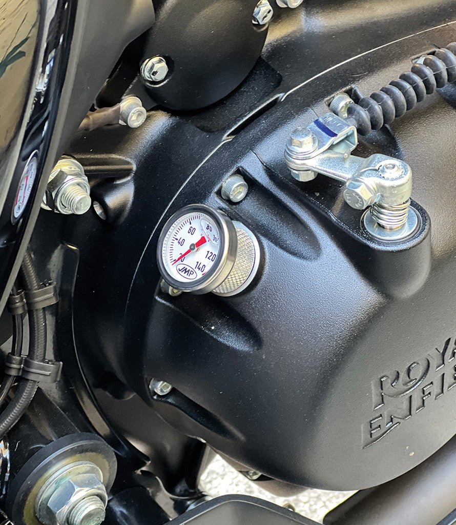Oil temperature sensor for Royal Enfield. Installs in seconds by replacing the original oil cap. Comes with a gasket.