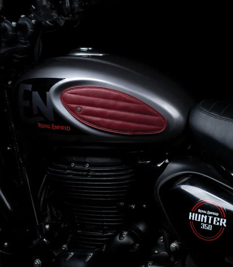 The tank side pads "The Hunter Tank Pads" are ideal for Royal Enfield HNTR 350. Made from premium leather "Trip Machine Crunch Leather", they offer great durability if cared for properly.