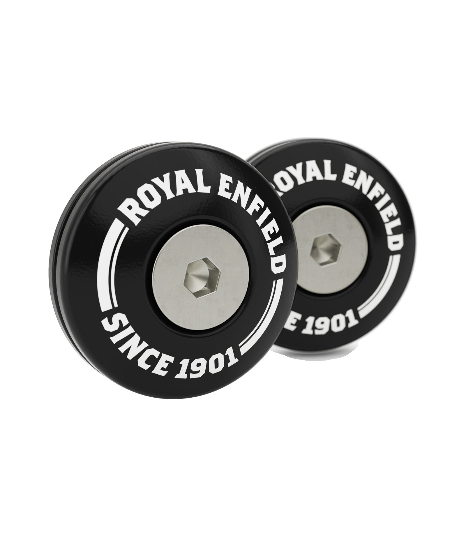 Handlebar ends motorcycles Royal Enfield Original Black with Logo, made from billet aluminium and anodised for long-lasting durability.