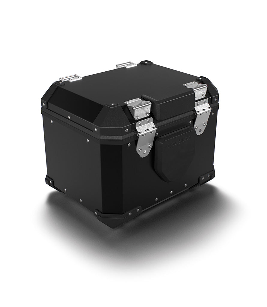 With its thick-walled aluminium construction, ABS corner protection, a capacity of 40 litres, and a payload of 5 kg, it can accommodate most adventure helmets.