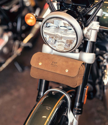 Enhance your style and functionality with the Duffle Bag Brown Front Bag for the Royal Enfield Super Meteor 650, a result of the collaboration between Cafe Twin and Trip Machine. Crafted from premium leather and waterproof canvas, this bag combines elegance and durability to accompany you on every adventure on your Seat motorcycle.