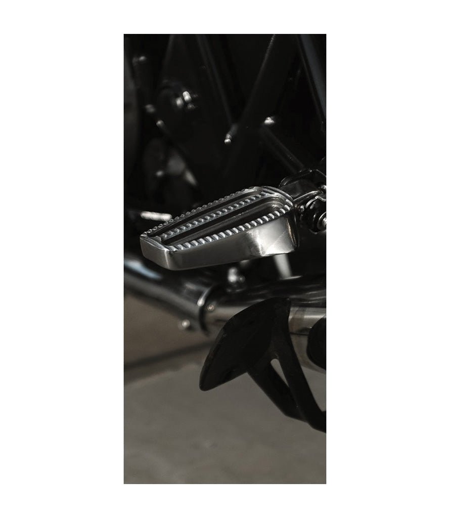 Repos-pieds Avant Triumph en acier inoxydable coulé sous pression, finition miroir réalisée à la main.
