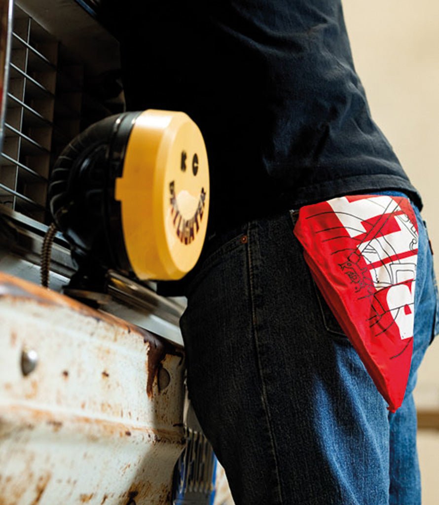 Il est recommandé de laver la bandana avant utilisation afin d’éliminer l’amidon qui la maintient plate pendant la production.