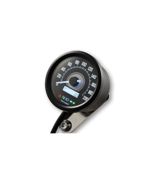 Contachilometri Digitale Daytona Velona 2 con Spie ideale per cafe racer e moto custom. Questo tachimetro moto tondo dal diametro 60 mm, prevede retroilluminazione bianca, con spie luminose (accensione, folle, abbaglianti e indicatori di direzione) Il campo digitale principale è centrato con illuminazione a LED bianchi.