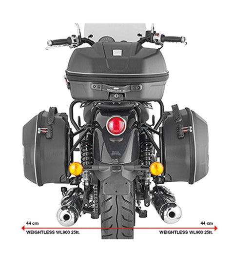 I telaietti laterali Givi PL9058 rappresentano la soluzione ideale per l'installazione di valigie laterali dotate di aggancio Monokey sulla tua Royal Enfield Super Meteor 650 a partire dal 2023.
